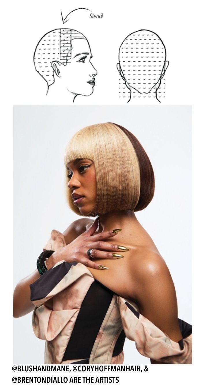 PROCESSING: Allow both colors to process for 25-40 minutes, no heat required. Rinse with cool water until water runs clear, do not shampoo. Using a round brush, dry a ½” section smooth to prep for stencil application.