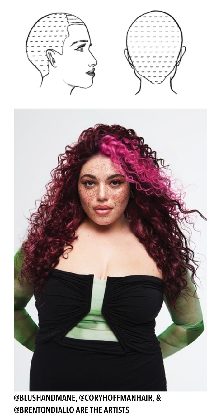 BLUSH: Apply Blush to the triangular section and use mesh to separate from the darker section. Let both colors process for 25-40 minutes, no heat required.